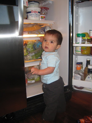 "Learn to Walk" was the theme of this month. He had randomly stood on his own a couple times so we took that as his cue to start walking, probably a little more seriously than he'd have liked! We worked and worked and worked. We even had friends and family working with him. So he started the month taking 5 steps from Jamie to me and eventually progressed to walking across a room. When I picked him up from the BSF nursery one day the lady told me he stood up on his own, walked across the room, then realized what he was doing, stopped, looked around and started whining for someone to help him. He has never done that for us. Now at the end of the month he will walk away from us towards something he wants, like a toy or the couch, and he'll let go of whatever he is holding onto and walk towards us, even without our prompting or knowledge. But walking is not his main source of transportation yet.
